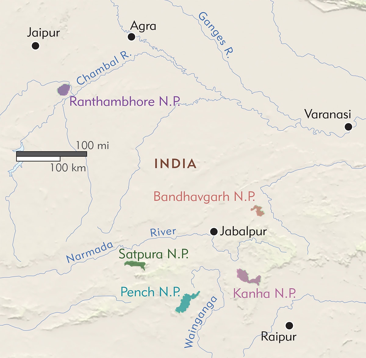 Highlighted below are five major tiger reserve national parks in India. Four of them are in Central India in the state of Madhya Pradesh, which has the highest population of tigers. The other is located in the state of Rajasthan. There are other national parks all over the country, but these five parks give you the best opportunity to see tiger and other wildlife. Some of the other animals to keep a lookout for depending on the park, are leopards, sloth bears, wild dogs, gaur, elephants, around 30 species of deer, monkeys, over 250 species of birds, plus jackals, and many more.