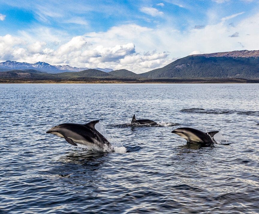 The day’s adventure appeared to be finished as we headed back to the mainland in our Zodiac, but nature had one more surprise in store—scores of dusky dolphins leaping and racing for a mile or more in all directions.