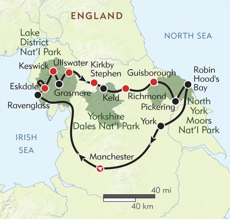 The route traverses three national parks: the Lake District, land of the writer Beatrix Potter, with its rocky terrain and upland pools; the Yorkshire Dales, where rolling green hills and pastoral valleys look straight out of a Jane Austen novel; and North York Moors, with its heather moorland and magnificent seaside cliffs.