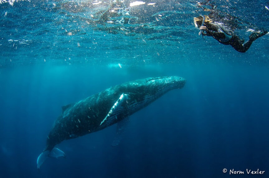 My goal as a photographer was to try and capture the sense of amazement that we experienced here in Tonga. In this photo, I was lucky to get a shot of my wife, Anne Vexler swimming face to face with this young whale.