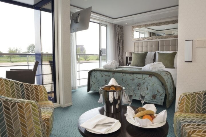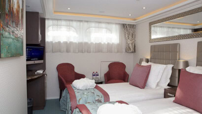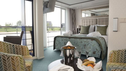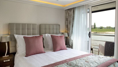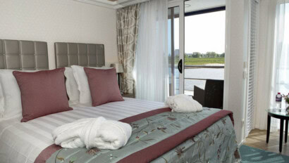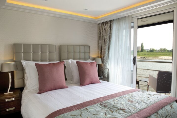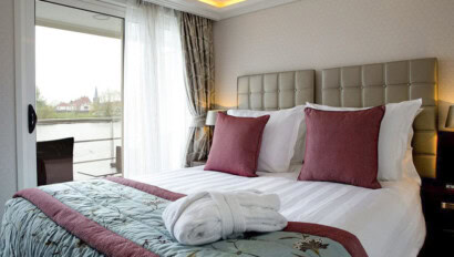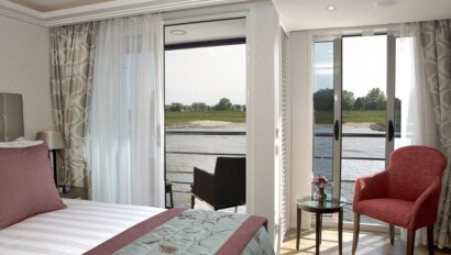 The 164-passenger AmaSonata features the most advanced design of any river cruise vessel currently in operation. Exclusive Twin Balconies are available in most staterooms, which measure a spacious 210-235 sq. feet, with four suites measuring 350 sq. feet. Gourmet dining with free-flowing fine wine is available at multiple onboard dining venues: enjoy Chaîne des Rôtisseurs culinary creations in the main dining room or in the Chef's Table restaurant with its own private chef, two Wine Bar venues, plus a casual al fresco bistro. On select days, guests can enjoy a lunch outdoors on the Sun Deck. There is also a heated sun deck swimming pool with a “swim-up” bar and whirlpool, and a fitness center and spa. Thanks to the computer provided in your stateroom and high-speed Internet access plus Wi-Fi, you can stay connected with friends and family back home. The exclusive movies-on-demand system offers Hollywood's current releases, a selection of classic films, or entertaining travel videos chosen to coincide with your itinerary. You'll also enjoy a variety of English-language news, sports and satellite TV stations, as a selection of music channels. It's all available on your flat-panel TV, and it's completely complimentary. The ship carries a fleet of bicycles and safety helmets free for you to use.