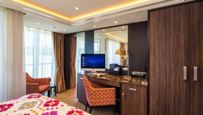 Large wardrobe, full-length mirror, hair dryer, safe and direct-dial telephone