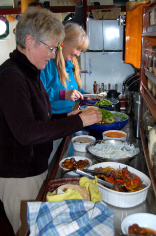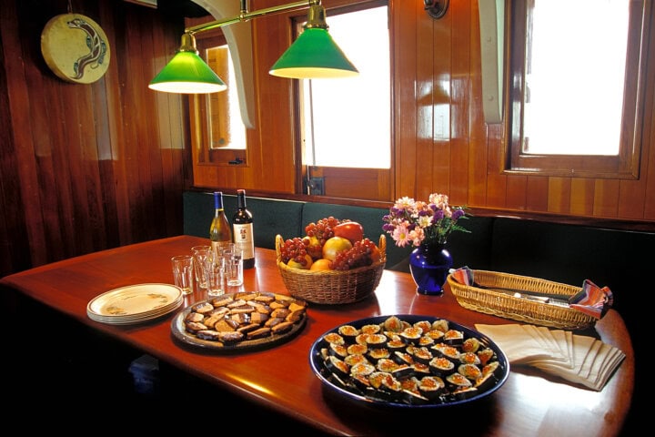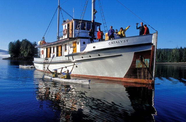 The 75-foot research vessel is a historic wooden boat that accommodates up to 12 guests. Constructed in 1932 as a marine research boat, she can maneuver around icebergs, follow whales, get close to glaciers, and tuck into tiny coves that most passenger vessels wouldn't even dream of approaching. Delicious meals, including freshly-caught seafood, are served by the chef in the warm, wood-paneled salon, and a fleet of kayaks (six doubles and three singles) on board add to the spirit of exploration and discovery.