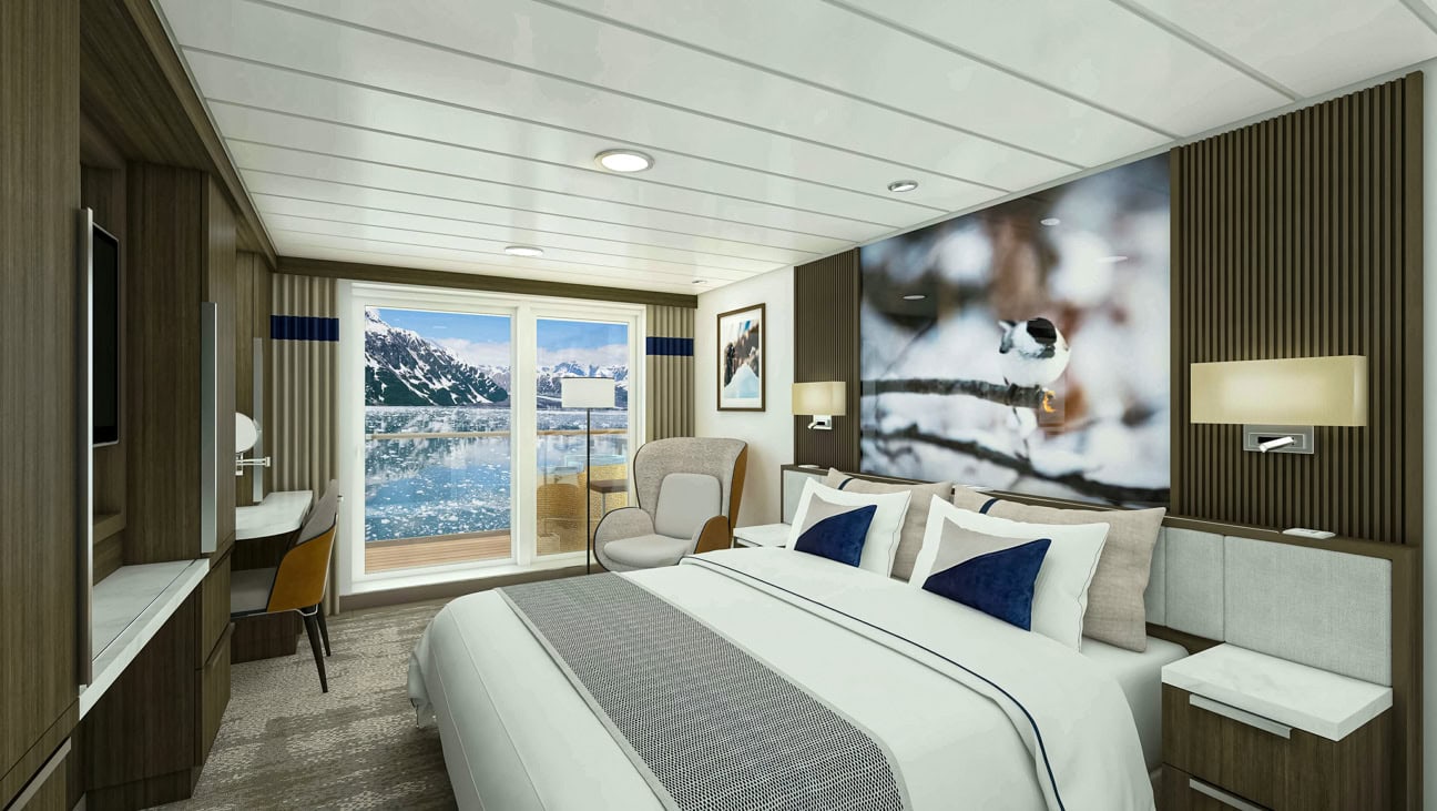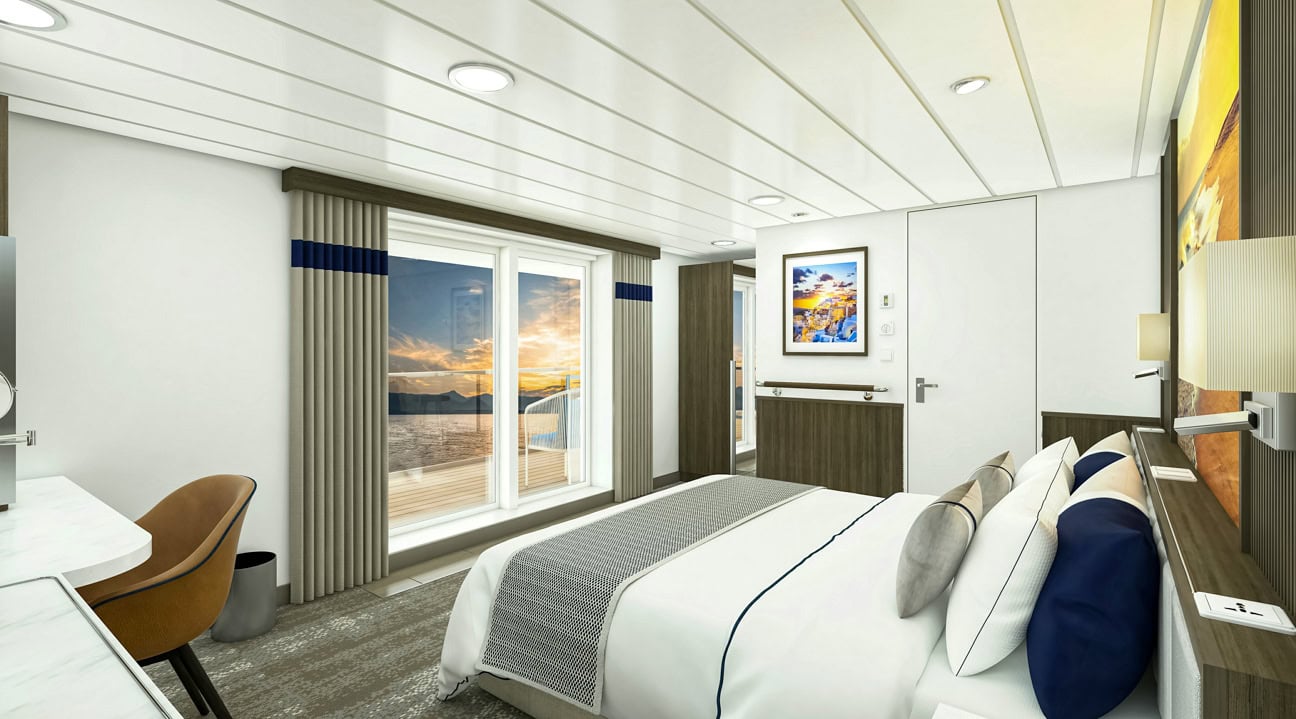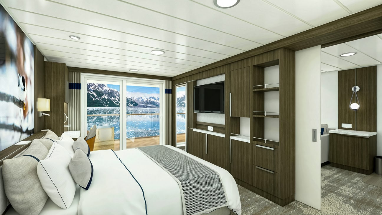 These cabins are on Deck 4 and 6 and are 299-390 sq. ft. in area. They feature floor-to-ceiling windows, en suite bathrooms, minibar, flat screen TV, and a desk area.