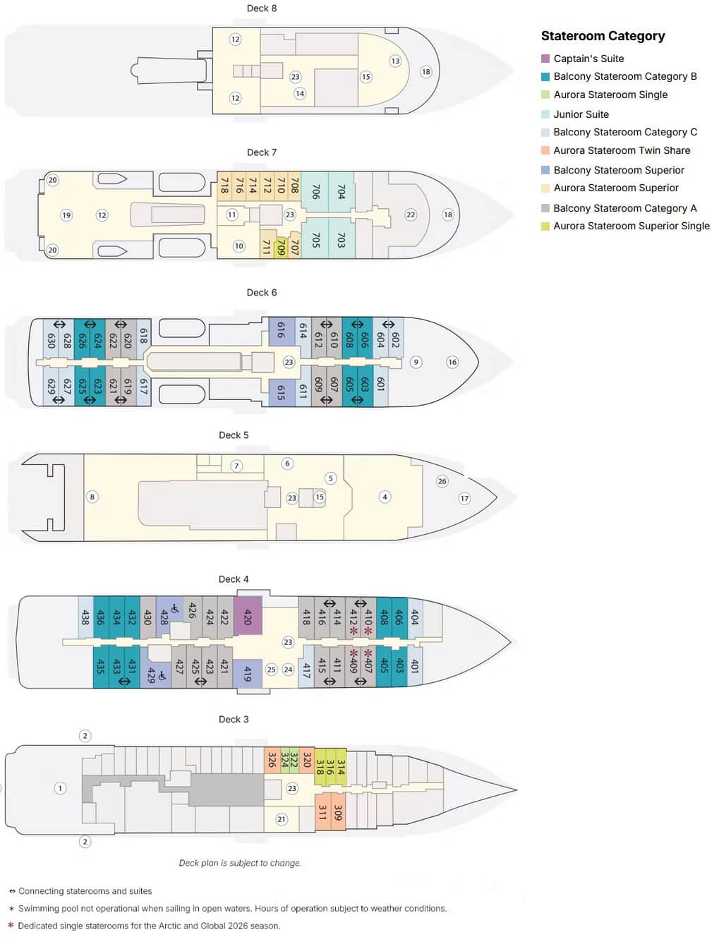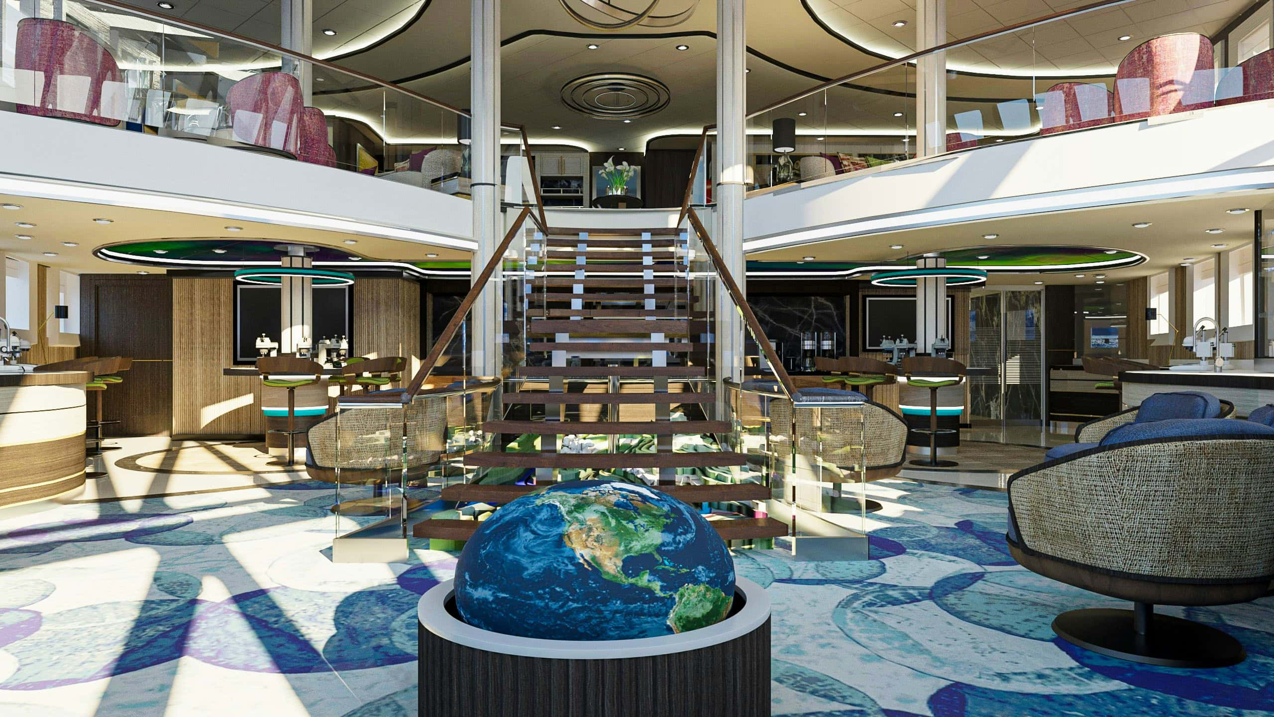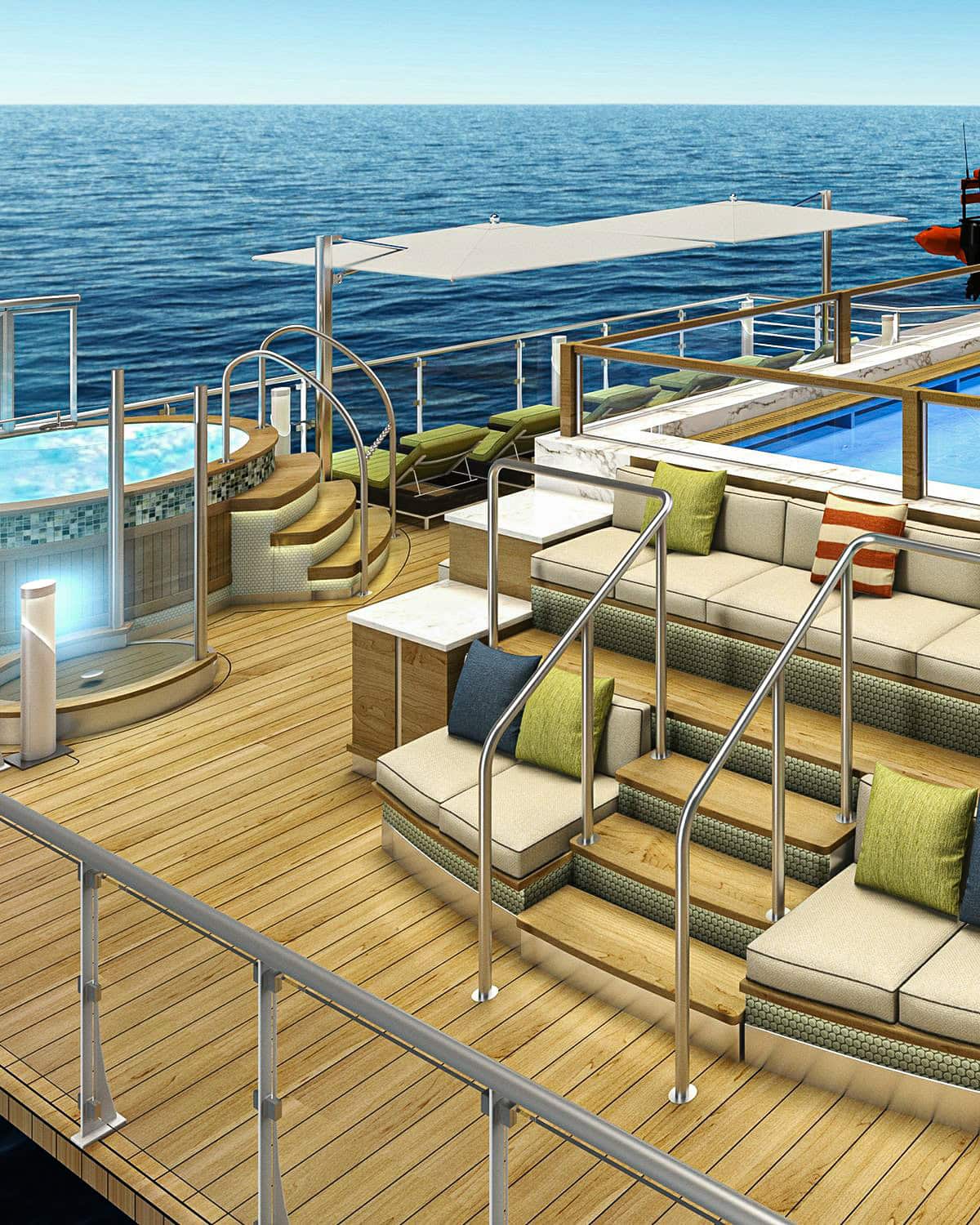 These cabins are on Deck 4 and 6 and are 299-390 sq. ft. in area. They feature floor-to-ceiling windows, en suite bathrooms, minibar, flat screen TV, and a desk area.