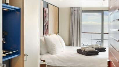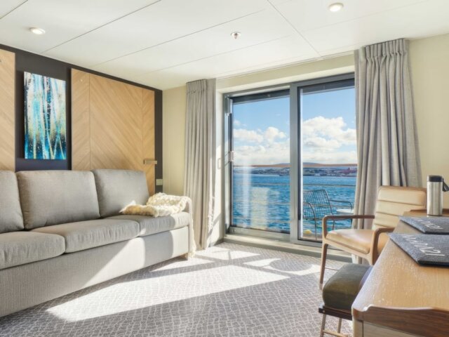 Grand Suite Cabins are 480 square feet in size and feature two rooms, a private balcony, along witha wardrobe, individually controlled heating system, and a private bathroom with a shower and heated floors.