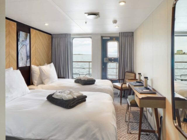 Single Cabins are 210 square feet in size and feature a private balcony, a wardrobe, individually controlled heating system, a sitting area, and a private bathroom with a shower and heated floors.