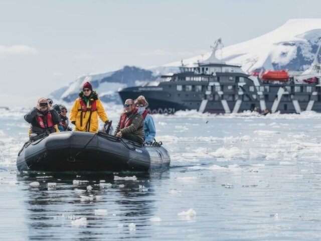 Named after the famous explorer, Ferdinand Magellan, the Magellan Explorer was custom built for Antarctic fly-cruising. Though she has a capacity of 100 passengers, guests are limited to 71 to ensure the ultimate small ship experience. The ship features a variety of comfortable accommodations including dedicated single cabins. All cabins except porthole cabins feature private balconies, and all double cabins except two have two twin beds that can be configured as one king-size bed. All cabins have a wardrobe, individually controlled heating system, a sitting area, and a private bathroom with shower. The ship has a glass-enclosed observation lounge and presentation room with state-of-the-art audio-visual equipment, a spacious and stylish dining room, well-stocked bar, library, meeting room, gym, sauna, and a medical clinic. The forward-facing observation deck leads to the bow of the ship, which is accessible to guests to offer proximity to marine wildlife. The ship has a fleet of 10 Zodiac boats that are well suited for disembarking and wildlife watching. The Magellan Explorer has a staff and crew of 60.