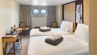 Porthole Cabins are 200 square feet in size andfeature a wardrobe, individually controlled heating system, a sitting area, and a private bathroom with a shower and heated floors.