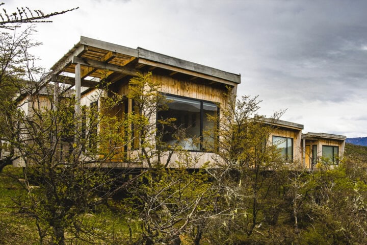 The seven modern chalet-cabins at the BordeBaker Lodge are cozy and comfortable, each with a wood-burning stove, floor-to-ceiling windows, and a small balcony with fantastic views over the turquoise Baker River. The cabins are connected to the main lodge by wooden walkways. The restaurant in the main lodge offers excellent meals sourced from local farms and gardens.
