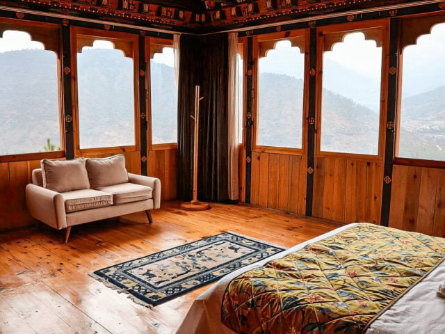 Tranquility meets elegance at this beautiful lodge, set high on a hillside in Punakha with stunning views of Punakha Dzong. The hospitality here is friendly and warm, and the staff takes great pride in offering an authentic farm-to-table dining experience, with mostly organic produce from the home's own garden. Six guest rooms are spacious and comfortable, and there is a nice garden and outdoor spaces to explore.