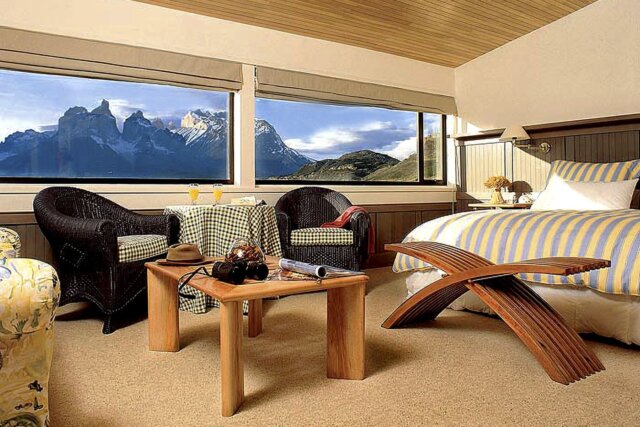 Strategically set on the shore of Lake Pehoè in Paine National Park, the 5-star Explora Lodge is a luxurious respite with sweeping views that frame Paine's granite towers and Lake Pehoè. Constructed in a modern, sleek Scandinavian style with beautiful exposed wood and glass, the Explora has attractive decor, delicious food (given the remoteness of the location), a good Chilean wine list, and panoramic mountain vistas from the public areas as well as most of the rooms. Many of the guest rooms also have jacuzzi-type bathtubs (great for a soak after a long hike) and there is a heated indoor pool. The Explora offers explorations including horseback riding, hiking, and overland adventures led by the expert staff. Please note that the Explora Lodge requires a 3-4 night minimum (depending on the season).