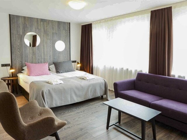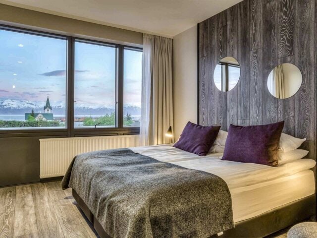 Húsavík calls itself the “whale watching capital of Europe” and this friendly hotel follows that theme, from its many paintings and sculptures relating to whales (and also a whale stamp collection!) to the Moby Dick bar and restaurant. Guest rooms are clean and simple, and the hotel is in a prime location for getting to our whale watching tour easily.