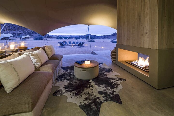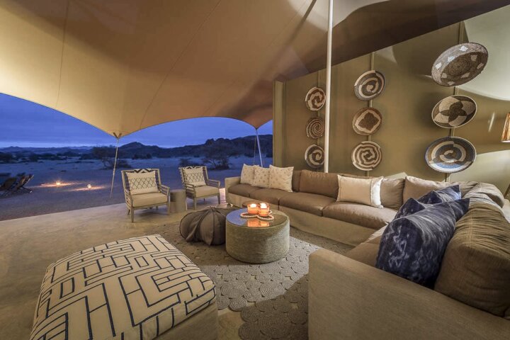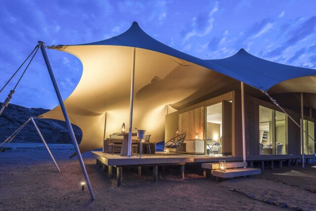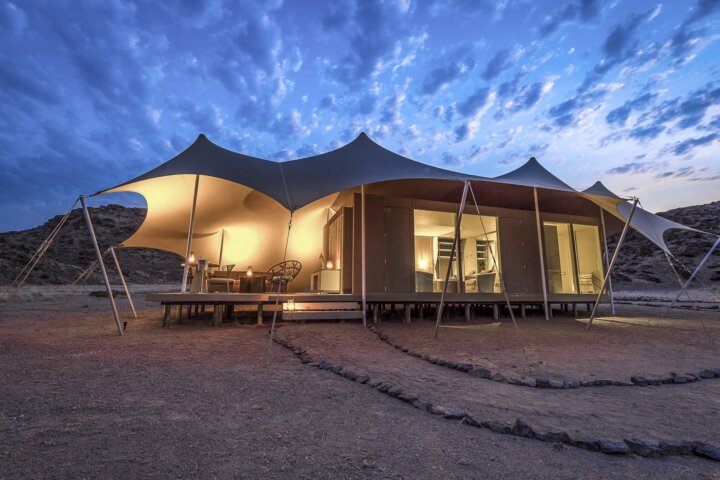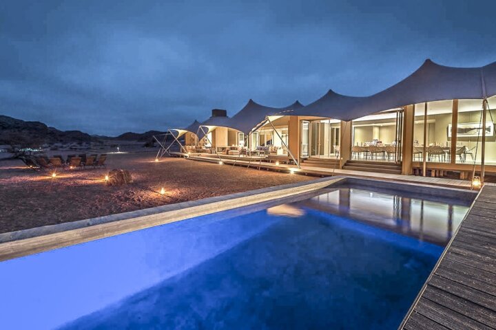 Set along the Hoanib River in the northern part of the private Palmwag Concession, the camp features a stunning location that straddles the Palmwag area and the iconic Skeleton Coast National Park in one of the remotest parts of the Kaokoveld. It is a classic camp with all the amenities including 10 en suite tented accommodations and an open-air dining room. Most of the rooms are twin-bedded units with 2 3-quarter beds and a shaded deck. The camp is 100% solar powered and maintains a very light footprint in this fragile environment.
