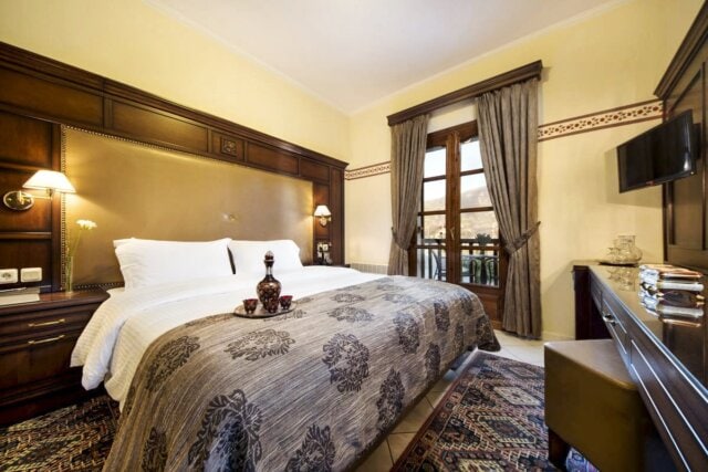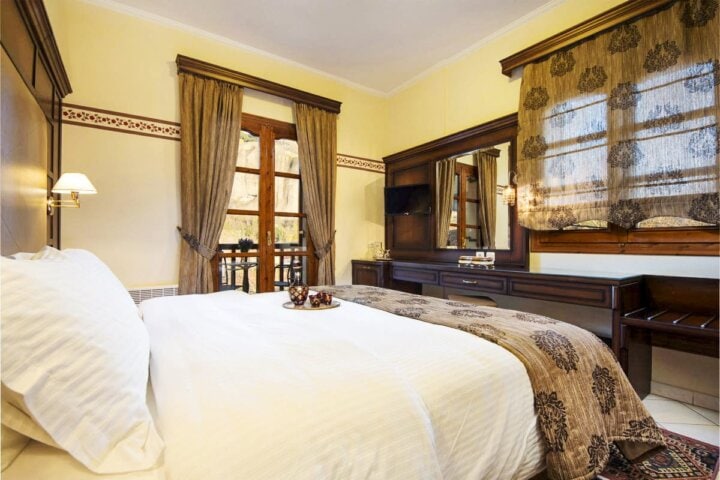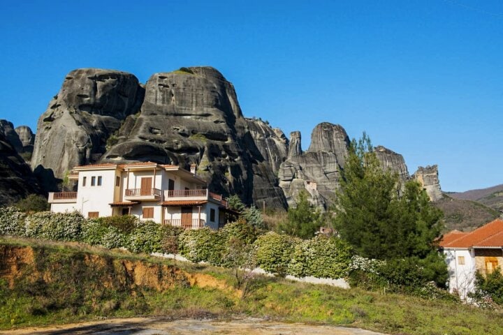 Right at the foot of the spectacular Meteora rocks, the Kastraki has grand views and comfortable air-conditioned rooms. It is situated near the traditional village of Kastraki on the road leading up to the monasteries—the first Meteora monastery is within walking distance of the hotel. From your balcony, you can gaze up at the amazing Meteora spires.