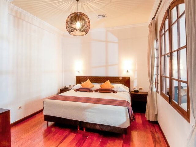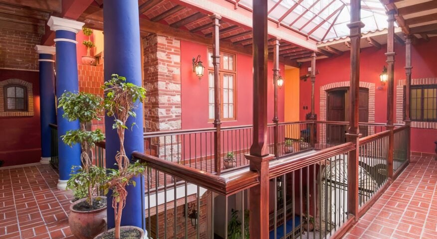 A 17th century colonial-style building in the heart of the historic center of La Paz, La Casona Hotel Boutique has a wonderful location for walking. The structure has been thoughtfully restored, and many original architectural features remain, including Gambote brick floors, adobe walls, “cañahueca“ arches and ceilings, tiered fountains, hand-carved stone doors, and windows carved in walnut wood. Guest rooms are comfortable, with wood floors, tiled bathrooms, and large windows with shutters. The rooftop deck has views of the city.
