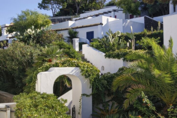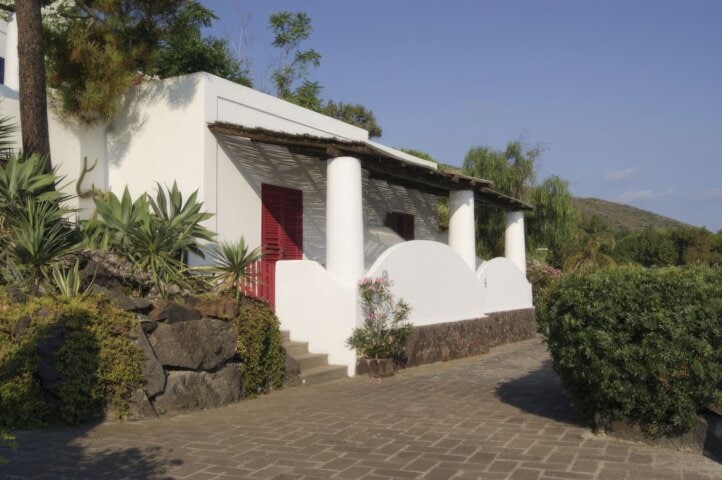 This family-run hotel is in an idyllic location, at the edge of the village and right across the street from a black sand beach. Guest rooms are simple but have an airy feeling and views of the sea. There is a beautiful saltwater pool with spectacular views of Strombolicchio, a craggy block of basalt rising from the water. Paintings of the volcano done by the owner hang everywhere in the hotel.