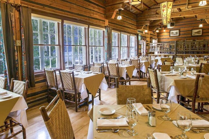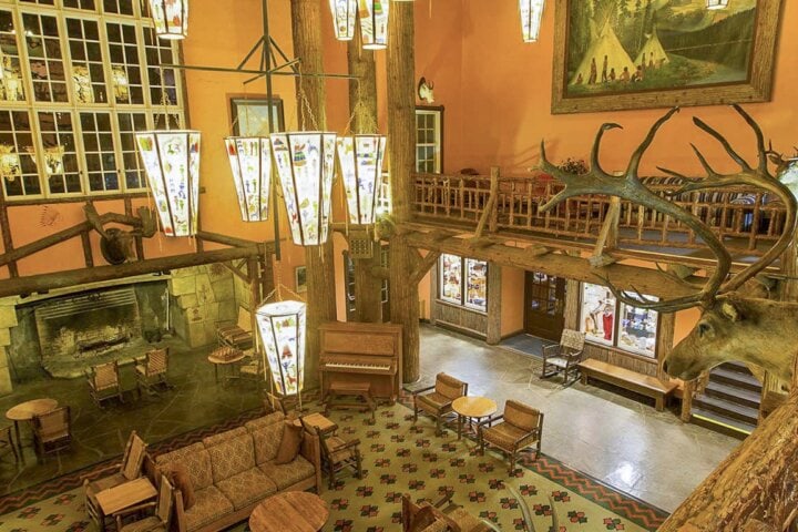 Historic Lake McDonald Lodge, built in 1913, is located right inside Glacier National Park, nestled on the shores of the largest lake in the park and just 10 miles from the west entrance. There are 82 guest rooms in the three-story main lodge, whose grand lobby extends to the third floor, replete with a massive fireplace and flagstone floor. It was designated a National Historic Landmark in 1987. Guest rooms are rustic, yet comfortable, with modest amenities. Televisions, air conditioning, and elevators are not available, and the WiFi signal is spotty, but the lodge has a truly spectacular lakeside location.