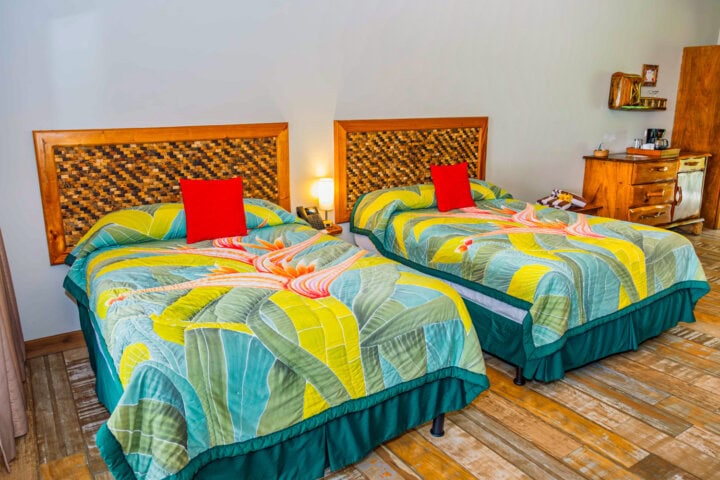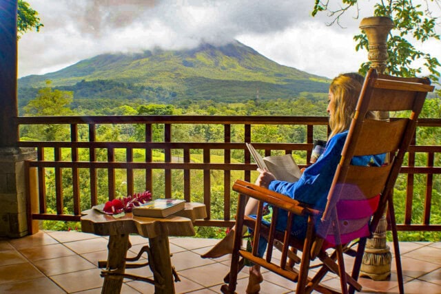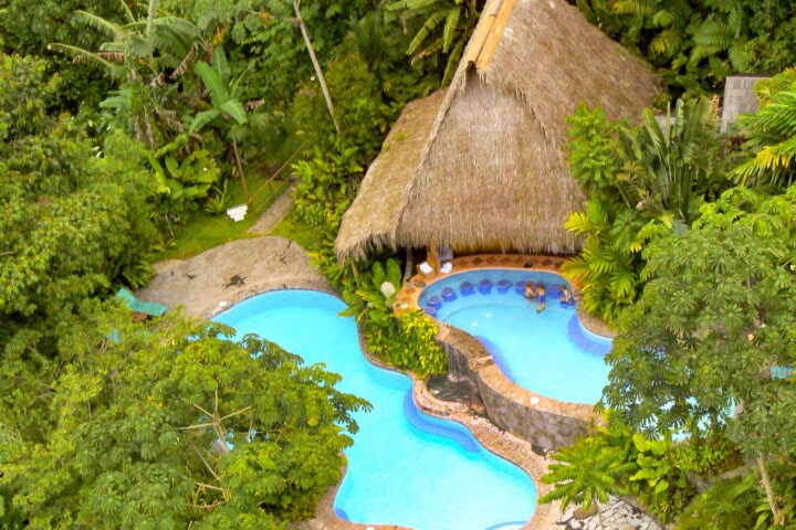 This wonderful resort is like an oasis in the middle of nowhere. While the rooms are not luxurious, they are very comfortable and private, and feature balconies with fantastic views of Arenal Volcano (assuming clear weather). An open-air restaurant serves delicious meals (try the ceviche and tilapia dishes) and the free in-room Wi-Fi is a plus. There are also beautiful gardens, a spectacular double pool with swim-up bar, and if you have some extra time, treat yourself to a soothing spa treatment.