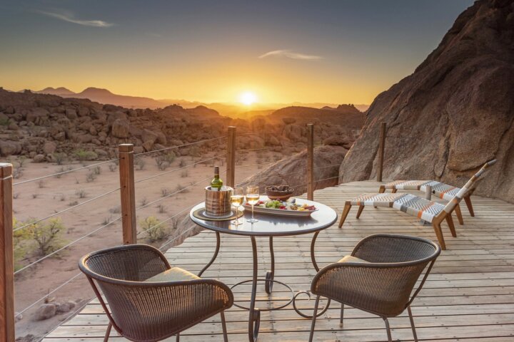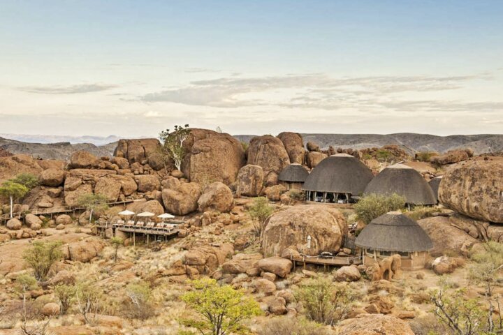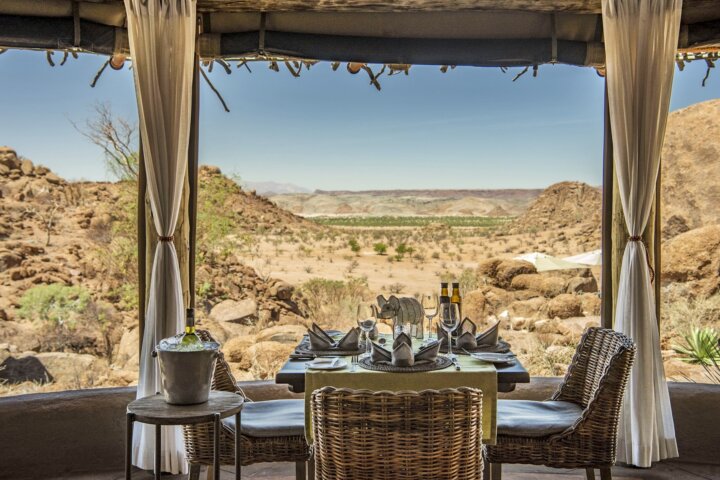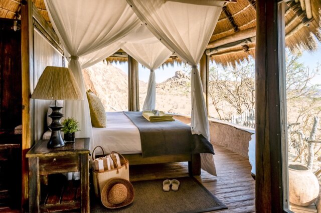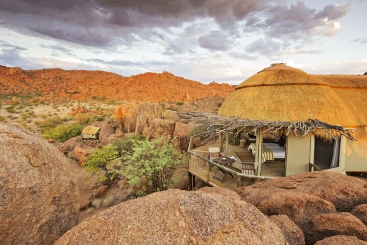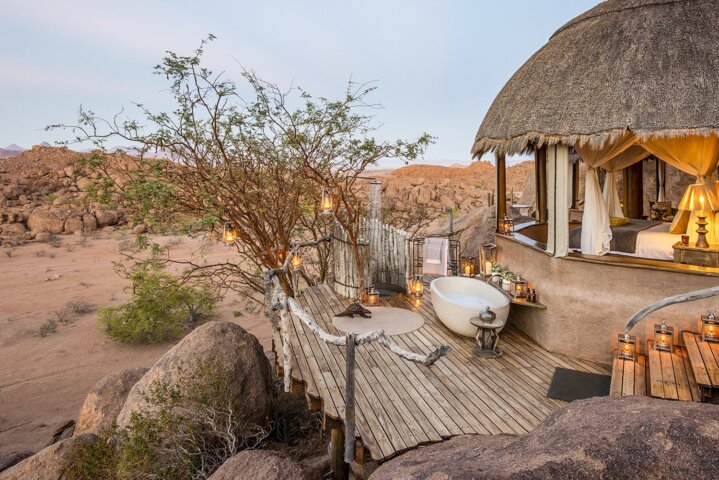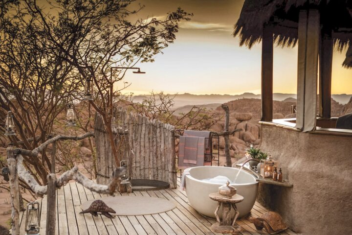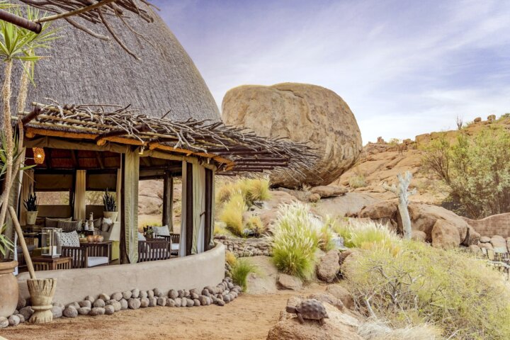 At Mowani Mountain Camp, tucked among giant boulders, our hosts welcome us with a wet towel and a cold beverage. Bungalows are set apart to allow for privacy and offer roll-up canvas walls, high-domed ceilings, and a wraparound balcony with a table and chairs, perfect for staying cool without en suite air-conditioning. Cool off in Mowani's small pool and spend your evening sipping a cocktail atop the flat sitting rock—the absolute best place to watch the sunset.