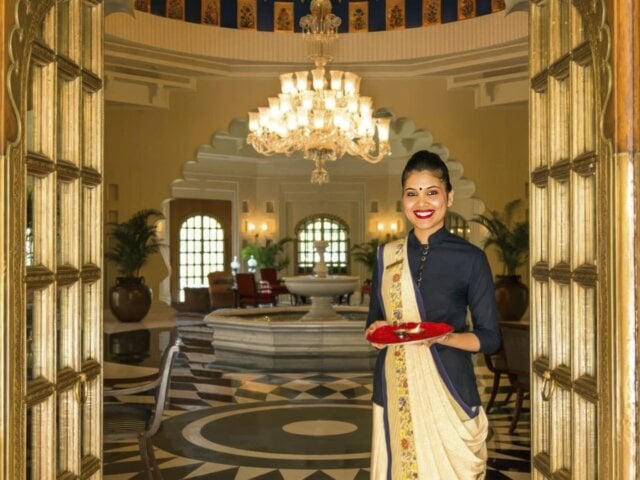 Built of sandstone and marble in grand Mughul style, this dramatic new hotel on Lake Pichola offers a royal ambiance with graceful domes, intricate tile flooring, grand staircases, Rajasthani artifacts, cascading gardens, and views of Lake Pichola. The swimming pools and spa are beautiful, and the staff is courteous. The Udaivilas' bar is very welcoming—after a day of exploring the old city, stop in and relax with a cocktail and some fresh warm cashews.