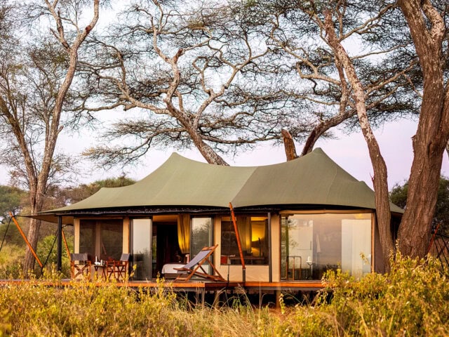 Set beneath mature acacia trees and facing the rising sun, Osunyai offers all the creature comforts of a seasonal camp, while retaining the relaxed casual feel of a mobile camp. Luxury safari tents are set to maximize the view in front of camp, where game meanders in search of grazing. The tents are large and airy with full-width windows and en suite bathrooms, king-size double or two extra long single beds, hanging wardrobe, luggage racks, and interior solar light tables. Each has a private veranda. A very large tent forms the nucleus of the camp, an ideal spot to relax and enjoy the tranquil ambiance. In the dining area, you can enjoy delicious meals, sample wines from South Africa and beers from the region, as well as the normal selection of soft drinks, juices, and spirits.