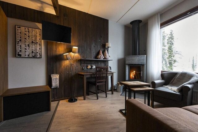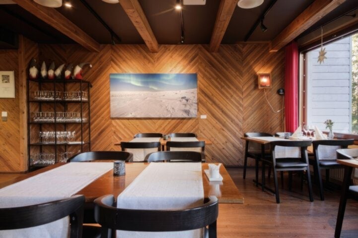 Situated in a perfect location near activities like reindeer sleigh rides and snow-shoeing adventures, this cozy hotel has comfortable rooms with wood detailing, a relaxing sauna, and an open dining room with large windows and a fireplace. Be sure to enjoy some hot cocoa near the hotel's grand fireplace after a day in the snow.