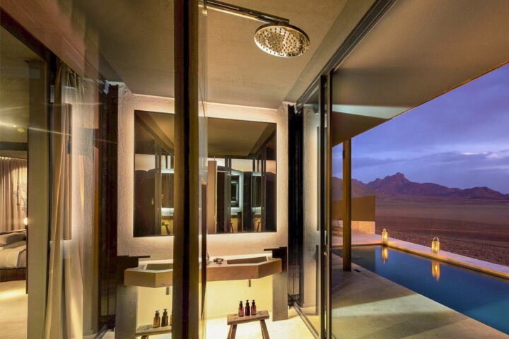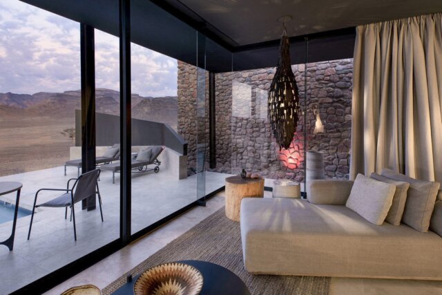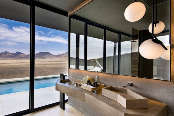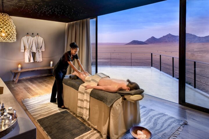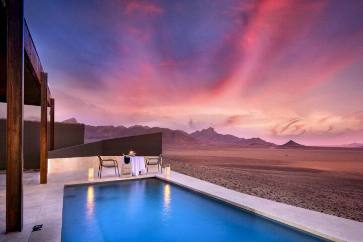 With sweeping views of the surrounding mountains and rock formations, Sossusvlei Desert Lodge is the perfect place to rest and rejuvenate following our explorations of Sossusvlei's red sand dunes. Guest rooms at Sossusvlei Desert Lodge are decorated in neutral desert colors and feature air-conditioning, private verandas with chaise lounges, king-sized beds, and an above the bed skylight that offers incredible views of the stars. For the ultimate in stargazing, Sossusvlei has an observatory where you can learn about the stars from the resident astronomer. Breakfast at Sossusvlei includes an array of offerings like fruit, cheese, eggs, and waffles. At dinner by lantern-light, you'll have the opportunity to try grilled wild game, including oryx gazelle.