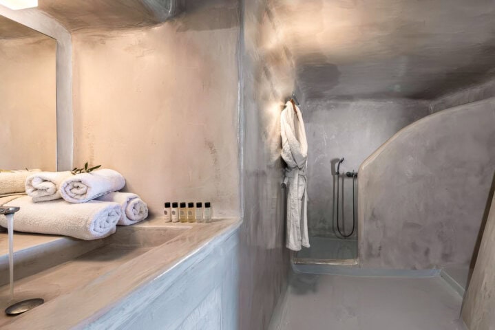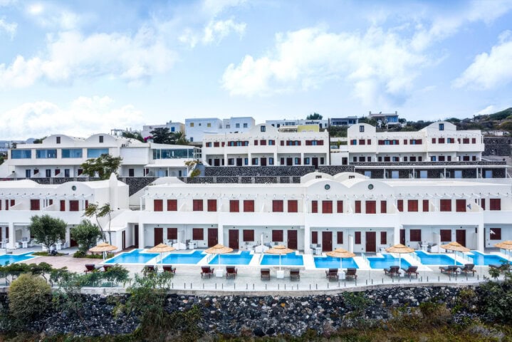 Nestled into its Cycladic surroundings stands the 5-star Splendour Resort Santorini, a tranquil property with sweeping views over the Aegean Sea. This resort has four buildings for guest rooms and another two for their lobby, dining, and pool bar. Each room features minimalistic design and decor, keeping with the iconic style of the islands, and offers comfortable beds, spacious bathrooms, and nice sea views.