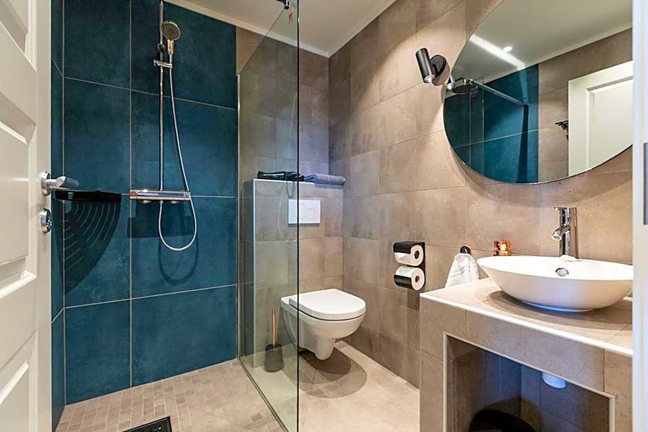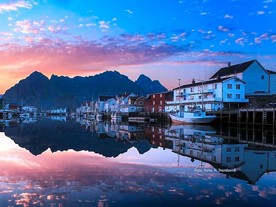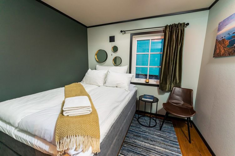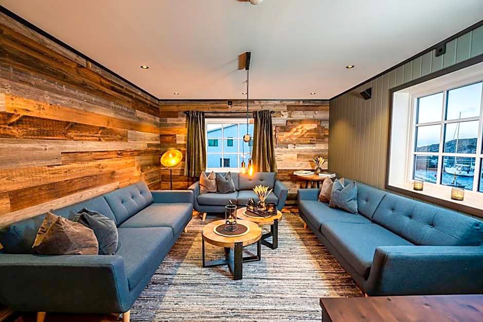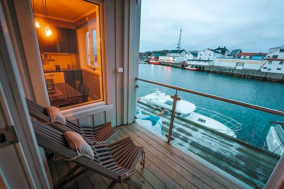 Tobiasbrygga is a large, modern apartment on the Henningær harbor with five double bedrooms, three bathrooms, and a fully equipped kitchen, along with sofas and long dining table with room for all guests.