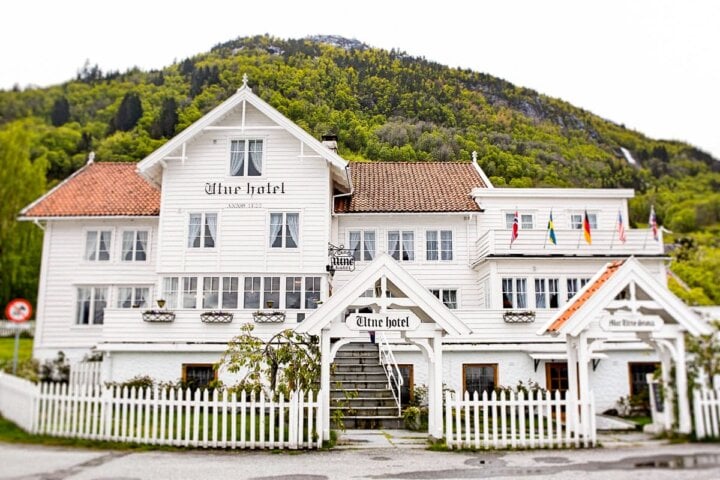 This charming and distinctive historic hotel, set along beautiful Hardangerfjord, has been in continuous operation since 1722. Although recently renovated, the Utne still retains its beautiful old world charm. The staff is warm and welcoming and the food is superb. Menus are based on produce from the west part of Norway, and dishes are seasonal, with respect for local food culture. Lamb and smoked salmon are some of the typical summer offerings. Unfortunately, the hotel cannot provide vegan meals, but vegetarian options are available. Getting here couldn't be easier—it's right in front of the ferry dock!