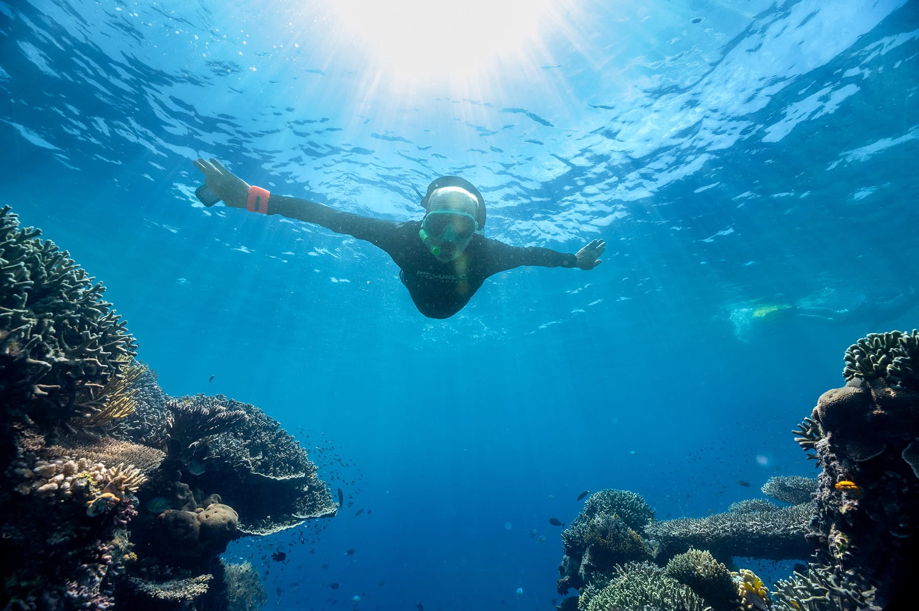 Another day, another rarely visited Micronesian gem. Nukuoro Atoll is a classically shaped atoll that reveals a sandy ring at low tide. Intermittent ship access has ensured the approximately 370 locals living on just .7 square miles of land live a traditional, subsistence lifestyle while running a small black pearl farm. Known for its Nukuoro wooden figurines, the atoll has a rich history influenced by both Polynesian and Micronesian cultures. Archaeological finds reveal Nukuoro has been inhabited since at least the 8th century and traditional practices and art forms, including sculpture and tattooing, are still carried out today. The atoll’s famed navigators still use stars and wave patterns to find their way across the ocean. Snorkelers can expect to be immersed in thriving marine life, lush corals, and a sense of ocean wilderness. Explore thriving reef communities, follow schooling surgeonfish grazing on reef flats, or stop to watch the vibrant damselfish surging among colorful coral bommies.