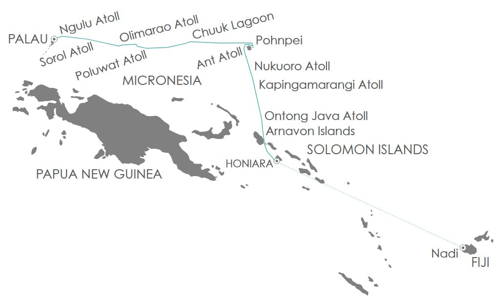 A mere speck in the world’s largest ocean, Satawal is an unspoiled paradise and the easternmost island in Yap State. Known for its stunning coral reefs and gin-clear waters, exceptional snorkeling is a given, while lush forests and powdery shores invite exploration. Satawal’s remoteness has ensured its protection and retention of ancient customs and skills, including its famed master navigators, who traveled between islands on hand-hewn canoes. Their legacy and prowess are captured in Steve Thomas’ recently updated 1987 book The Last Navigator. Visitors here are rare, so we can expect a warm welcome from the local community as we discover centuries-old navigational techniques where skill, observation, and nature guide every voyage.