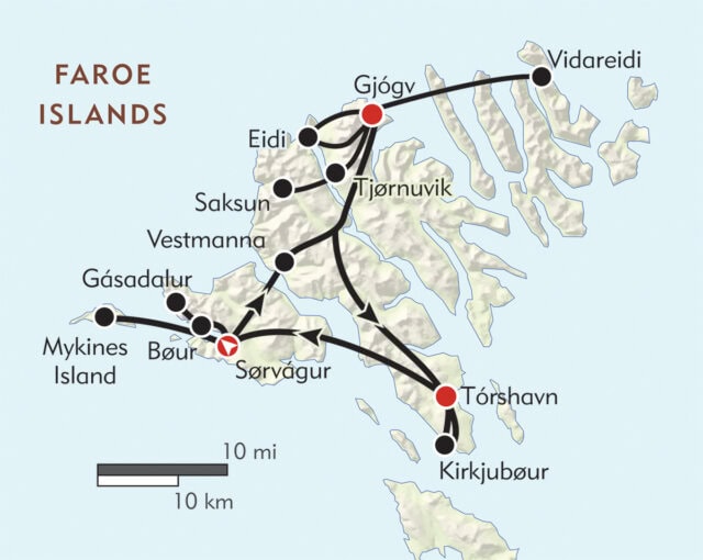 On Vágar, we hike the stupendous cliffs at Trælanípa for a view of Sørvágsvatn, a clifftop lake that seems suspended in the sky. A spectacular ferry ride below Faroese rock formations brings us to Mykines Island, stretching out in a spine of sheer cliff faces. We’ll walk through its turf-roofed village and hike to a puffin colony.