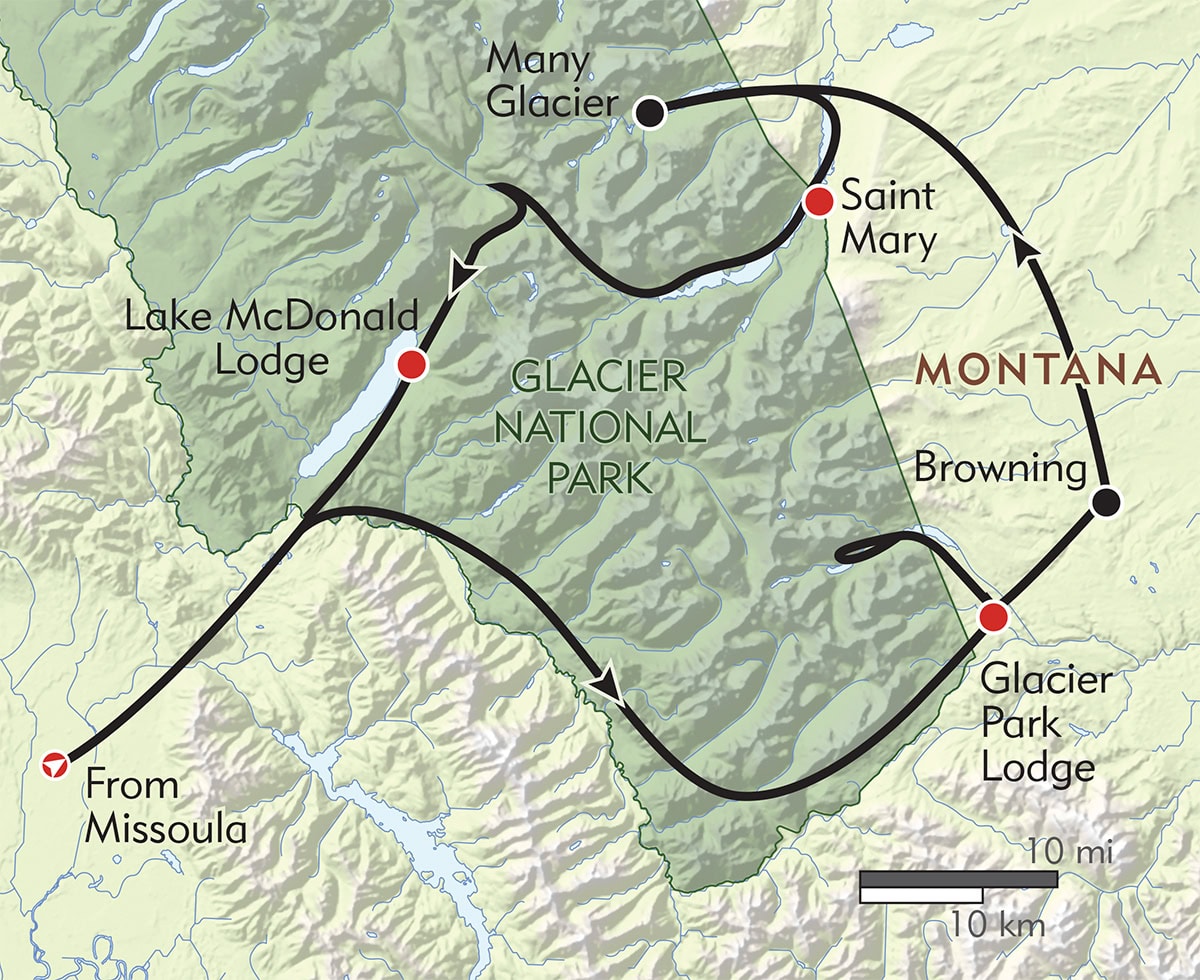 In St. Mary, Montana, near the eastern entrance of Going to the Sun Road, we hike below the ring of angular granite peaks that encircle 10-mile-long St. Mary Lake. Indian paintbrush and lupine should be in bloom on the hills, and long summer evenings give us a chance to savor sunsets in one of the most beautiful places in the world. On our last day, we set out for the must-do drive over Going to-the-Sun Road to reach the Continental Divide at Logan Pass, with our final overnight at forest-ringed Lake McDonald Lodge on the shores of the park’s largest lake. Depart on Day 9.