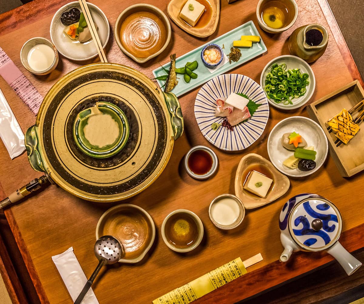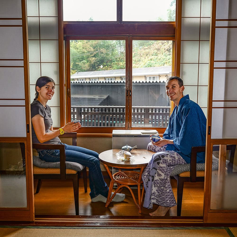 Normally, a fresh cotton yukata (robe) is provided for each guest. These light kimonos can be worn anywhere in and around the ryokan and we often wear them to meals (make sure to wear the left side over the right). For many of our breakfasts and dinners, beautifully presented meals are served as we sit on the floor at low tables on our tatami mats.