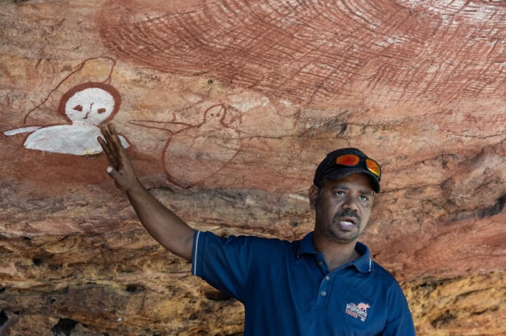Today the ship navigates the scattered islands, known as the Bonaparte Archipelago, which stretches almost 95 miles along the dramatic coastline. Our destination today is the remote and unspoiled inlet of T-shaped Swift Bay with its sandy beaches, ominous sea-worn caves, and mangroves. A Zodiac cruise here allows a closer look at this incredible coastline where you will also likely observe salt-water crocodiles. On land, several rock art galleries display the unique Wandjina and Gwion Gwion styles on a large scale, denoting the region's cultural importance.