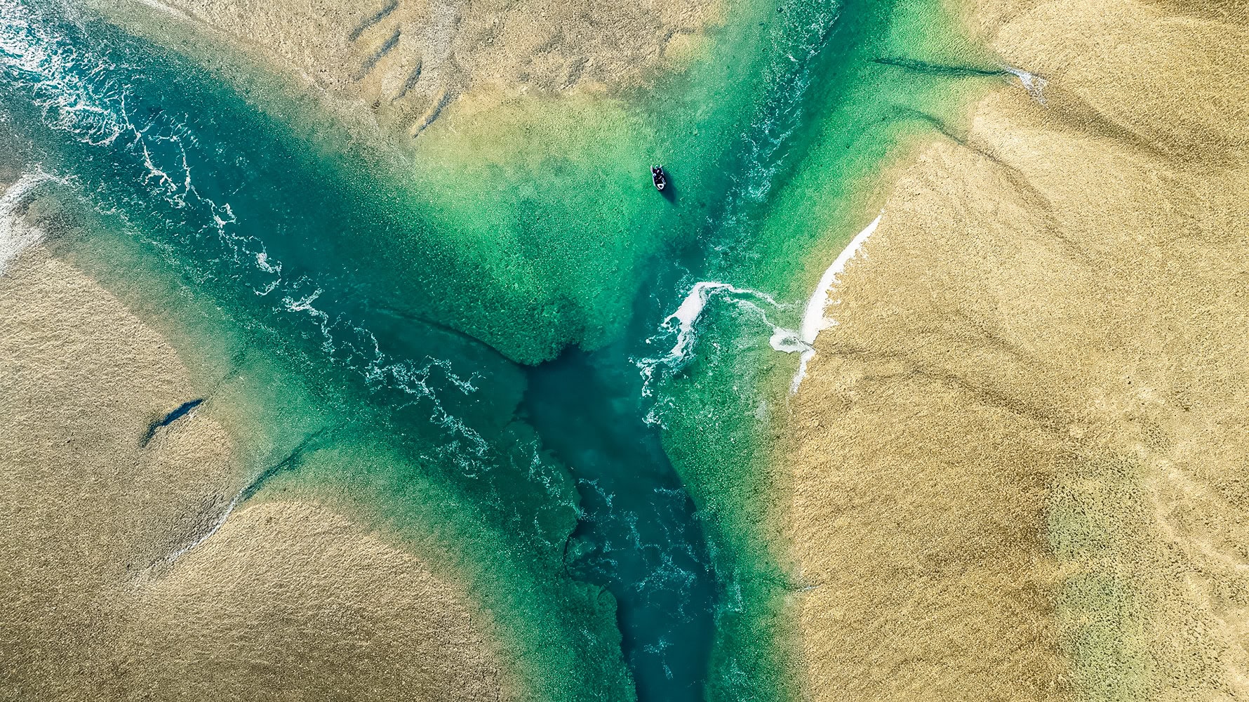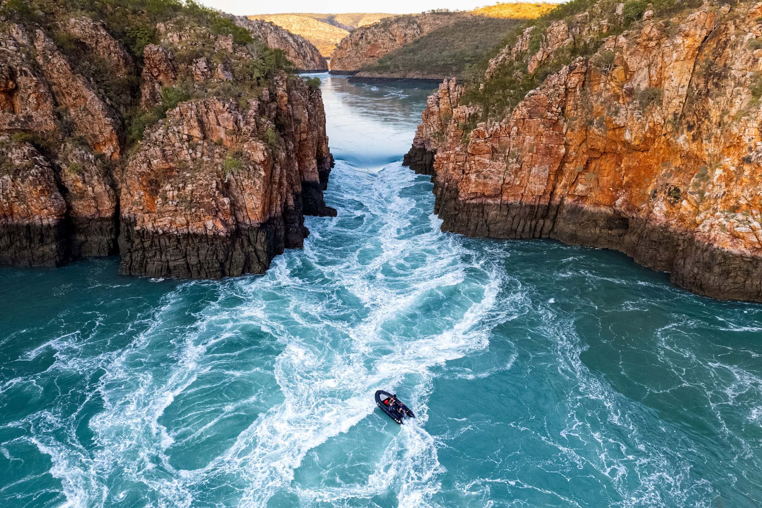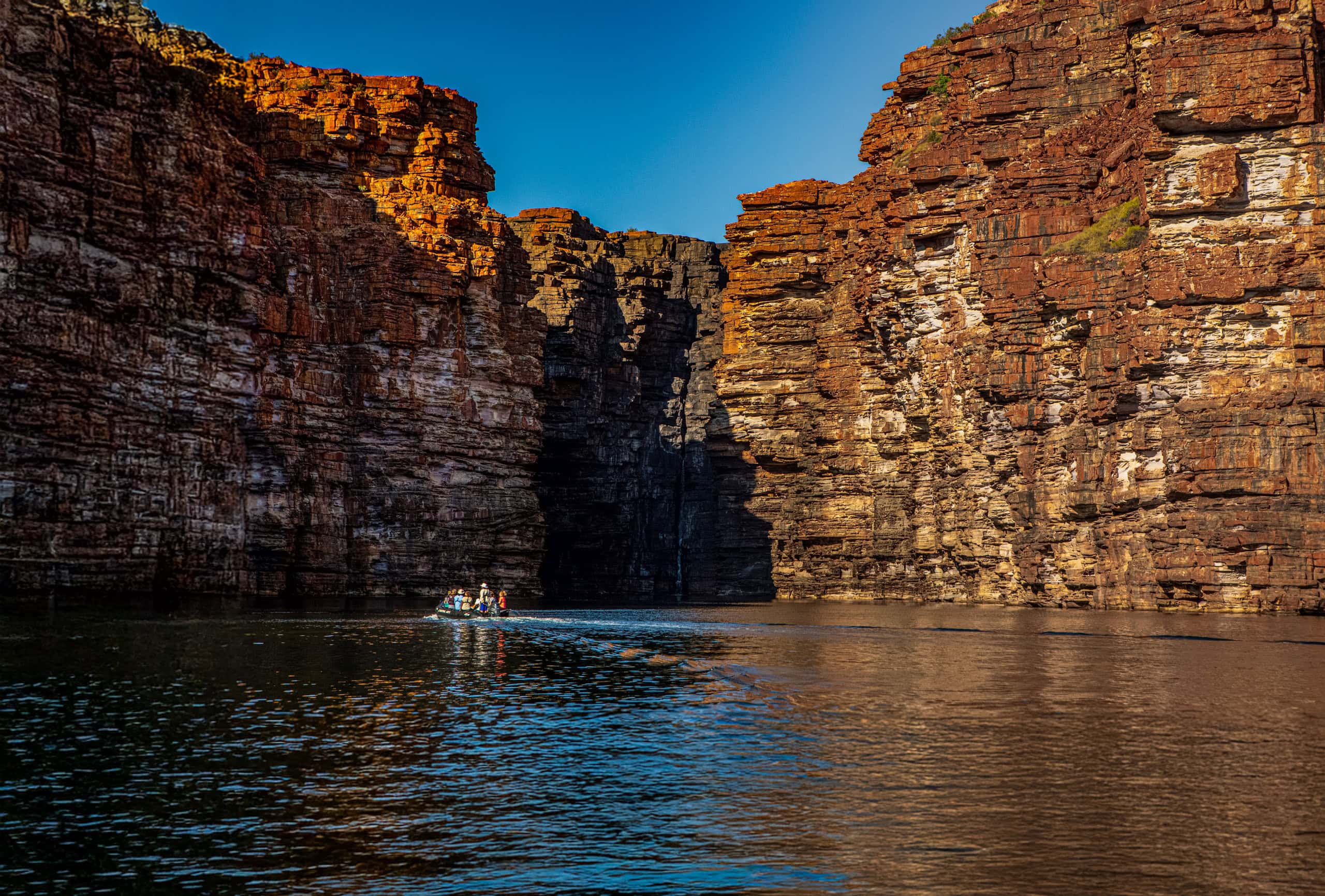 Located at the eastern end of the Buccaneer Archipelago, and only accessible by sea, you have two days to explore the ancient land- and seascapes of Collier Bay and its astounding natural attractions. At Talbot Bay, experience the power of the region's massive tidal movements that have shaped the landscape, most famously at the world's only Horizontal Falls. Here you will witness what David Attenborough described as “one of the greatest wonders of the natural world” as trapped water in an inland bay thunders between two narrow chasms, as the tide drops more than 45 feet on the other side, creating spectacular falls, whirlpools, and boiling whitewater. At nearby Cyclone Creek, explore the twisted geological folds of the ancient seabed and hope to see inquisitive tawny nurse sharks among the incredible marine life on display, while another tidal spectacle awaits at Montgomery Reef at the bay's center. We hope to capture the magic of observing this enormous reef “rise” from the ocean as the tide falls create torrents and waterfalls up to 10 feet high and displace marine life, igniting a feeding frenzy as predators above and below the water descend. At Freshwater Cove, shoreline explorations of the caves and grottos reveal a multitude of ancient rock art galleries.