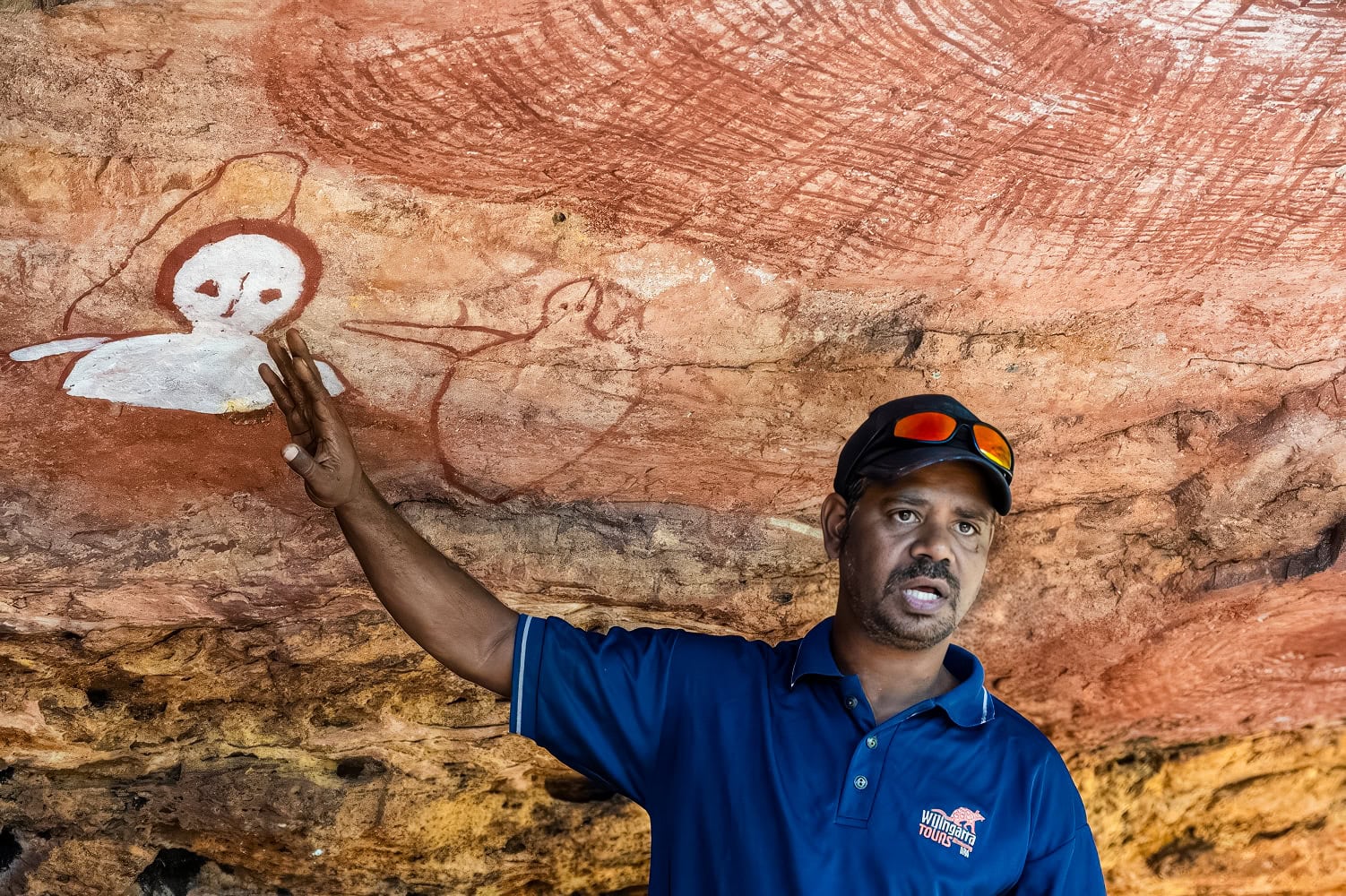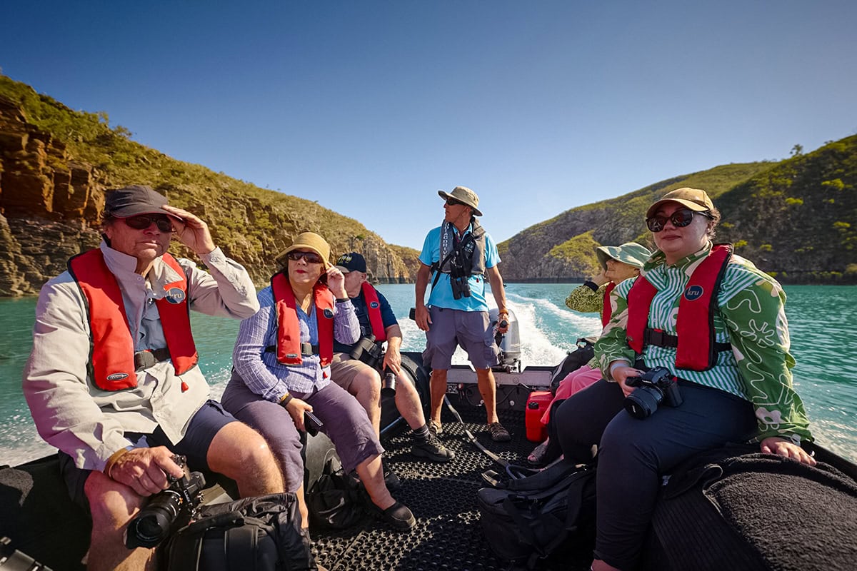 Today you'll explore the sites of ancient Aboriginal rock art on Bigge Island and the historic Mermaid Boab Tree, which bears the name of the HMC Mermaid that was famously carved into it while the ship was beached there undergoing emergency repairs during Philip Parker King's third voyage of discovery of the region in 1820. Now measuring some 10 feet wide and National Heritage listed, the tree offers a glimpse into Australian colonial history, while an old Makassan Islamic prayer alcove can be found behind the tree. Here, you will also explore the jaw-slackening, otherworldly sandstone coastline of York Sound with its incredible sea caves and fascinating wildlife.