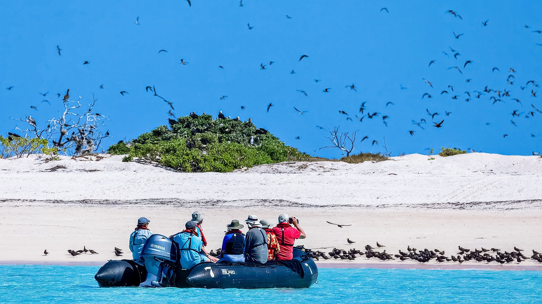 Today we explore the incredible wildlife reserve and birding paradise of the Lacepede Islands. Designated a nature reserve in 1970 and rat free since 1986, this collection of four unassuming islands off the northwest coast of Western Australia are recognized as an Important Bird Area by BirdLife International with what is thought to be the largest breeding colony of brown boobies, up to 18,000 pairs, in the world. These small, low-lying spits of coarse sand and coral rubble atop a platform reef are also the state's most important breeding grounds for green turtles. Other wildlife that calls these remarkable islands home include roseate terns, masked boobies, Australian pelicans, bridled, greater and lesser crested terns, eastern reef egrets, lesser frigatebirds, and pied and sooty oystercatchers, while grey-tailed tattlers, whimbrels, bar-tailed godwits, ruddy turnstones, and great knots are among the visiting vagrant species. While landings are not permitted, we plan to explore the island's incredible shores by Zodiac and, if lucky, we may see some humpback whales that frequent this coastline during their northern migration in winter and early spring.