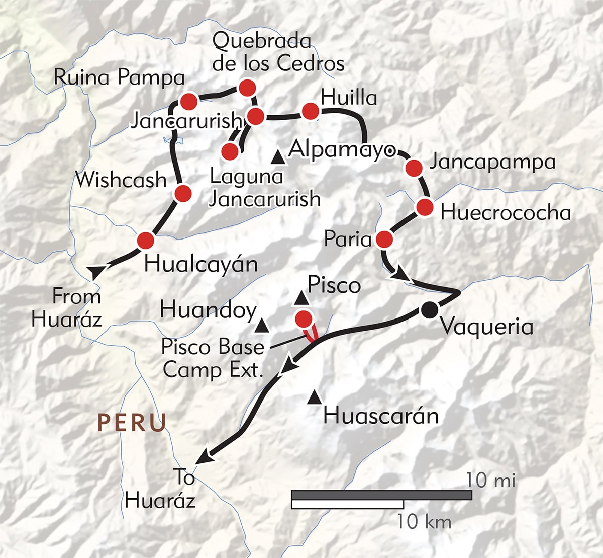 Our last three passes are Pucajirca, Tupatupa, and Pucaraju, where the knife-edged peak of Taulliraju towers above. Return to Huaráz and depart on Day 14.