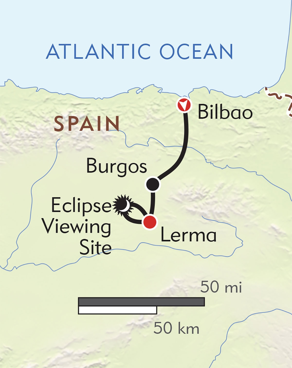 Traveling from Bilbao to Lerma, we’ll stop in charming Burgos, once the capitol of Castile and famous for its medieval architecture. We’ll walk the historic old town, tour the famed cathedral “Our Lady of Burgos,” known for its imposing Gothic architecture, and visit the Romanesque monastic complex of Santa María la Real de las Huelgas, known for its Mudéjar art and historic ties with Spain’s kings and queens. Our home base for the eclipse is the historic Parador de Lerma, the 17th century Ducal palace that is today one of the most important historical buildings in the region.